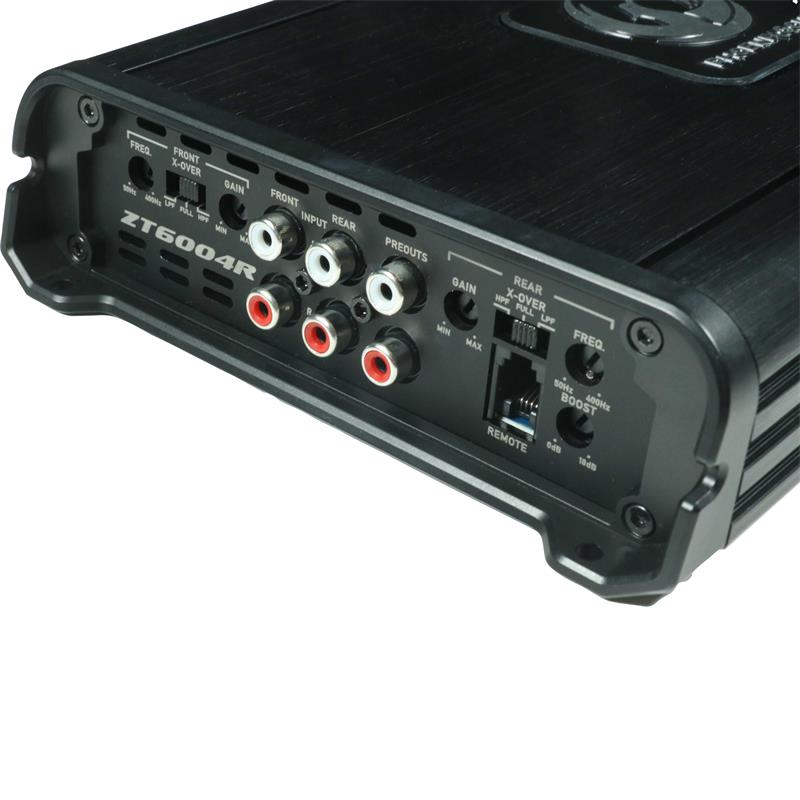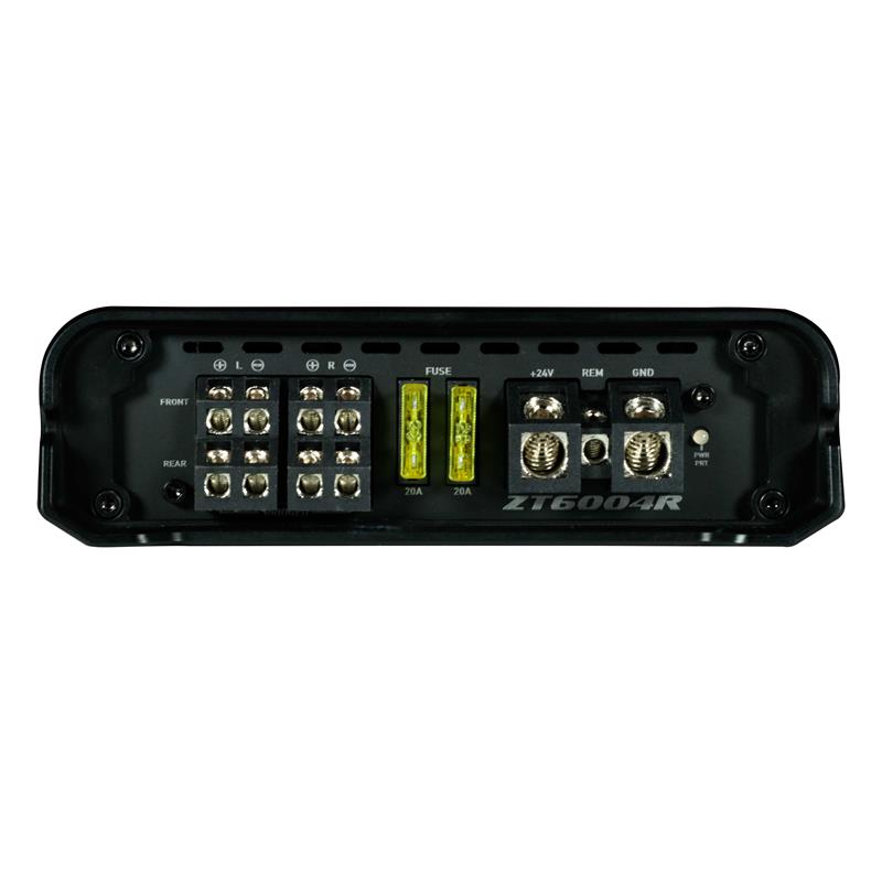 ZT6004R är ett kraftfullt 4-kanals 24V Class-D-förstärkare på hela 600W RMS fördelat på 4, 3 eller 2 kanaler i en kompakt design. Med sitt högkvalitativa kretskort i gulddesign och sina högklassiga anslutningsterminaler garanteras en ren, skarp och kraftfull funktion.