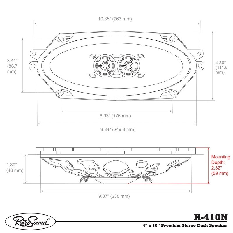 4×10″ (101x254mm) Solo högtalare för din klassiska bil, Retrosound R-410N är en 2-vägs DVC specialhögtalare på 160 watt för bilar med en högtalare i mitten på t.ex. instrumentpanelen eller i mitten på baksätet.