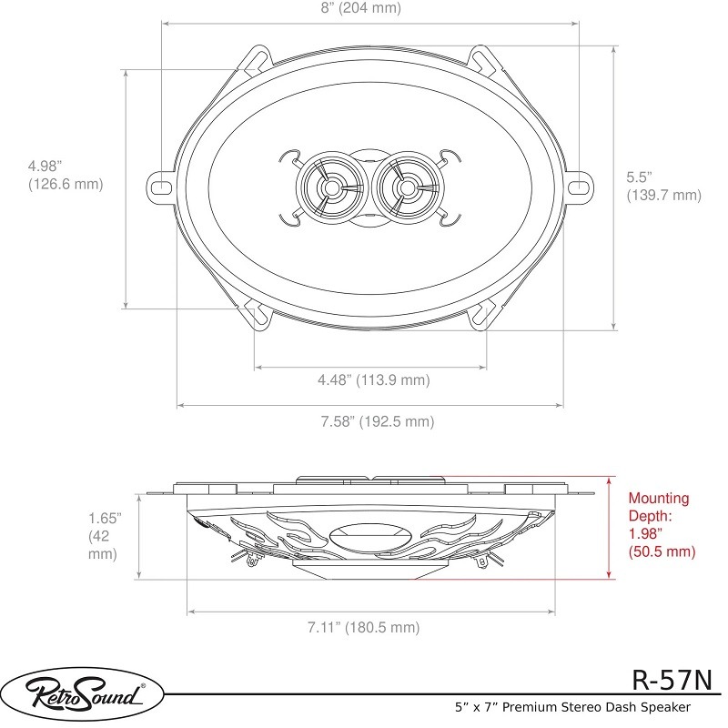 5×7″ (127x178mm) Solo högtalare för din klassiska bil, Retrosound R-57N är en 2-vägs DVC specialhögtalare på 100 watt för bilar med en högtalare i mitten på t.ex. instrumentpanelen eller i mitten på baksätet.