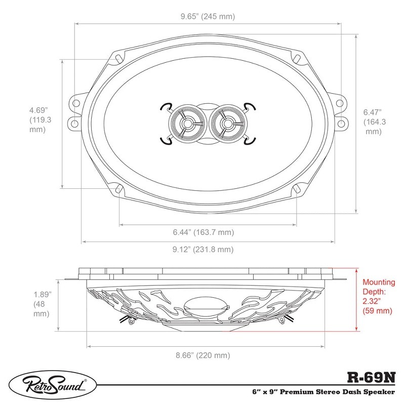 6×9″ (152x229mm) Solo högtalare för din klassiska bil, Retrosound R-69N är en 2-vägs DVC specialhögtalare på 200 watt för bilar med en högtalare i mitten på t.ex. instrumentpanelen eller i mitten på baksätet.